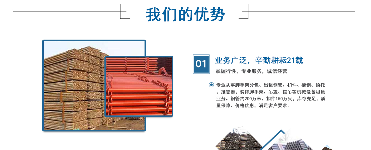 安徽海洋建筑工程機械租賃有限公司、淮南佳輝建筑工程有限公司是由淮南興勝鋼管租賃公司起家的,從事專業腳手架資質分包、鋼管、扣件、槽鋼、頂托、接管器、裝飾腳手架搭設、吊籃、搭吊等機械設備的租賃業務。公司成立于1999年,憑借著專業水準和成熟技術,在業內迅速崛起并不斷發展創新。